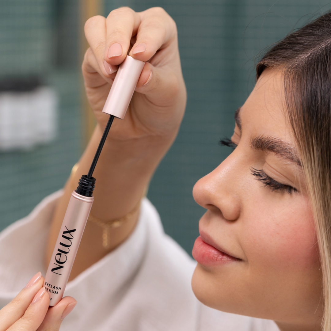 Unlike conventional serums with synthetic prostaglandins that risk irritation and eye color changes, Nelux uses only botanical peptides and biotin—safely nourishing lashes from root to tip.
